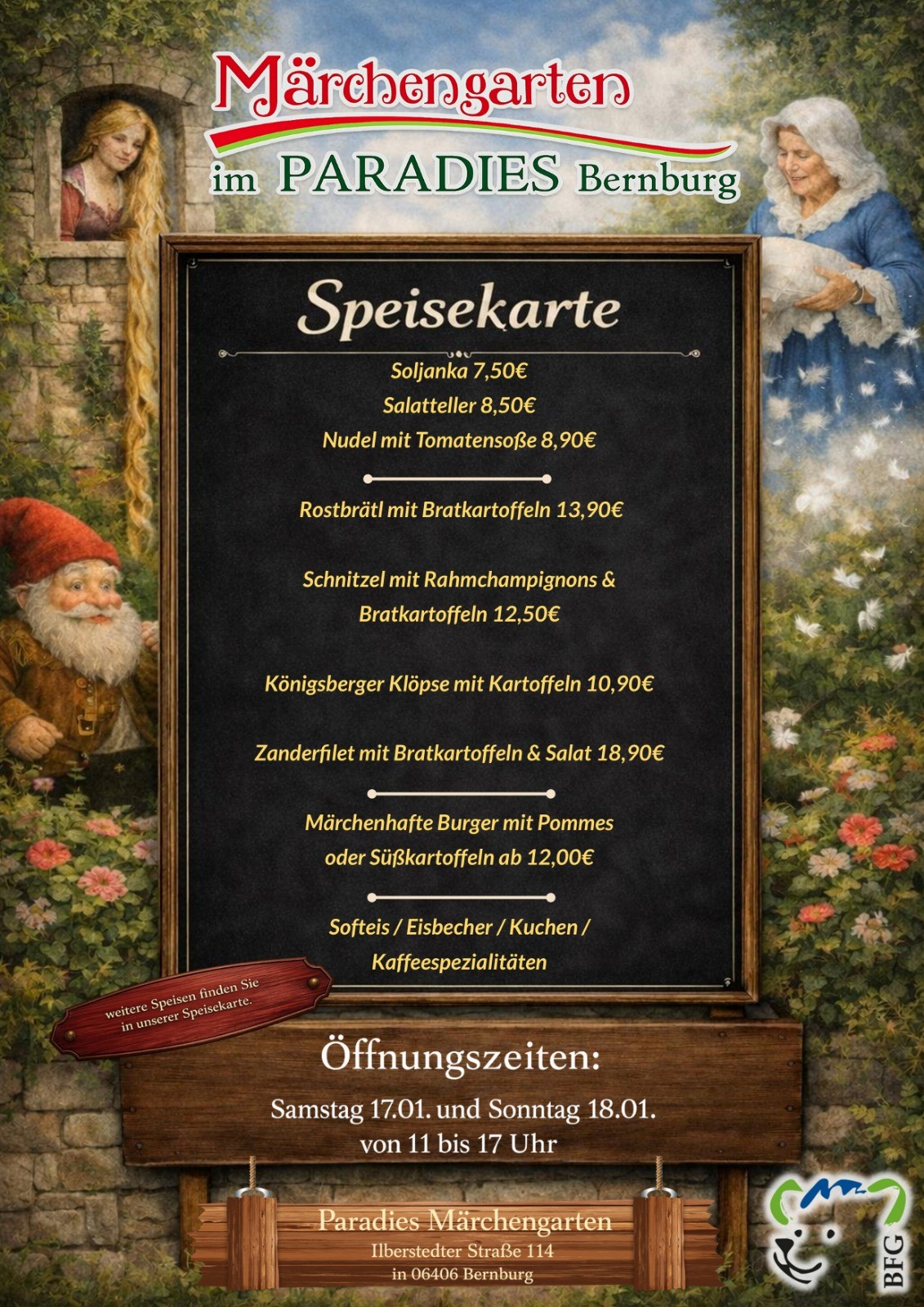 Zauberhafte Märchenwelt – Es war einmal…, die Geschichte des Märchengartens Paradies reicht bis ins Jahr 1920 zurück. Der Begründer des Märchengartens, Herr Alfred Lahne, übernahm in dieser Zeit das Ausflugslokal von seinem Vater und legte in mühevoller Kleinarbeit einen attraktiven Steingarten an. Um 1930 begann er diesen mit Märchenfiguren zu gestalten, welche er auf Spielzeugmessen erworben hatte. Seitdem ist die Ausflugsgaststätte ein beliebtes Reiseziel für große und kleine Gäste und ist über die Landesgrenzen hinaus bekannt.